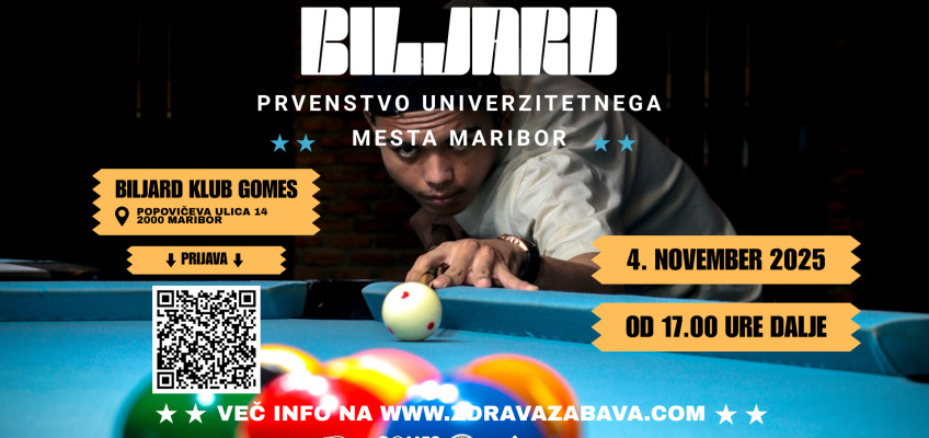 Univerzitetna športna zveza Maribor v sodelovanju z Biljard klubom Gomes in Biljardno zvezo Slovenije vabi vse študentke in študente k udeležbi na Prvenstvu univerzitetnega mesta Maribor v biljardu, ki bo potekalo v torek, 4. novembra 2025.