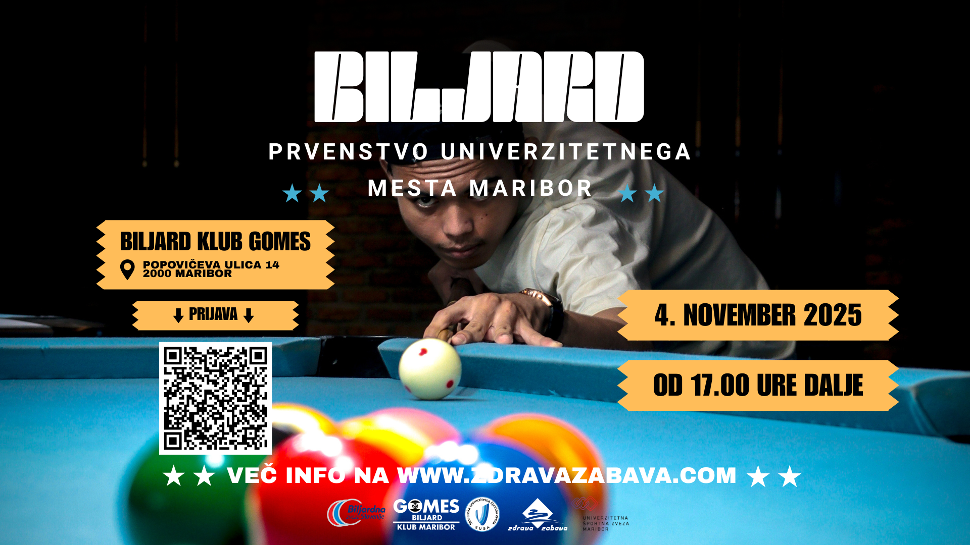 Univerzitetna športna zveza Maribor v sodelovanju z Biljard klubom Gomes in Biljardno zvezo Slovenije vabi vse študentke in študente k udeležbi na Prvenstvu univerzitetnega mesta Maribor v biljardu, ki bo potekalo v torek, 4. novembra 2025.