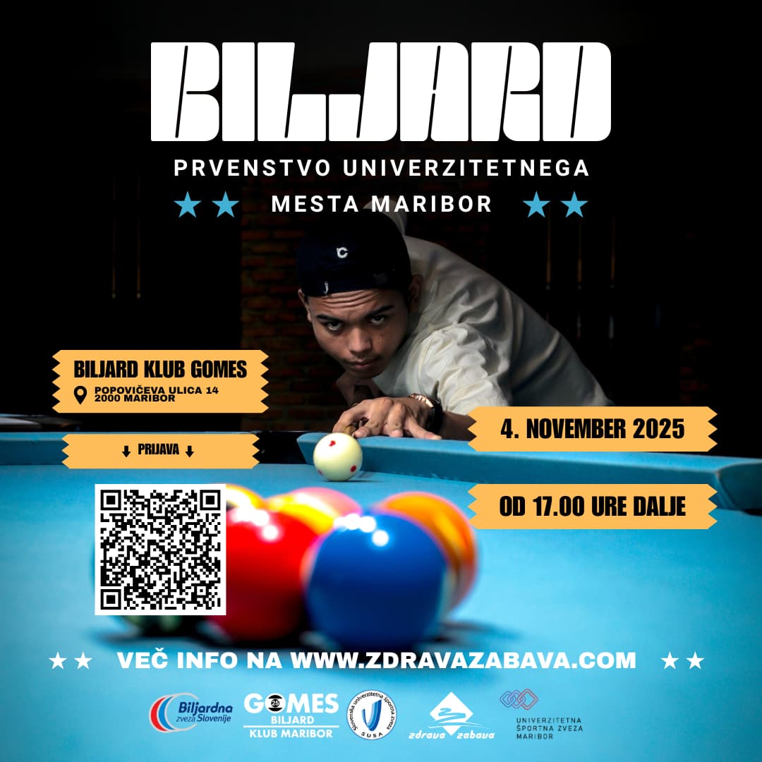 V torek, 4. novembra 2025 smo v sodelovanju z Biljard klubom Gomes izvedli Prvenstvo Univerzitetnega mesta Maribor v biljardu za leto 2025. Sodelovalo je 5 nastopajočih, ki so se pomerili vsak proti vsakemu.